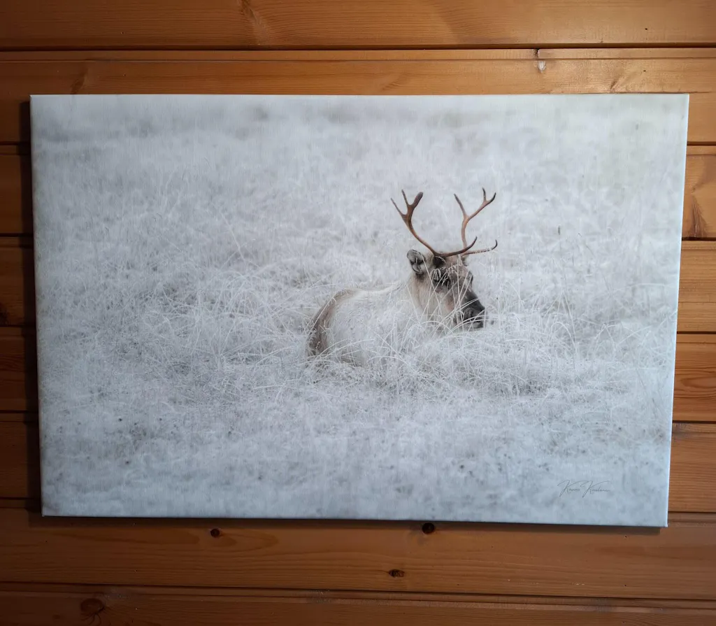 Kävimme perheen kanssa Lapissa ensimmäisen kerran muutama vuosi sitten. Sen jälkeen kaipuu sinne on ollut joka vuosi. Tämä ihana poron kuuravuode -taulu muistuttaa meitä Lapista joka päivä.